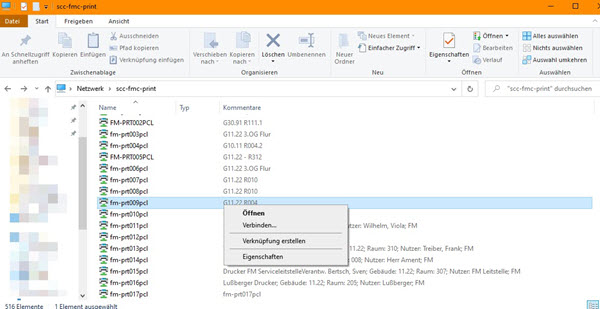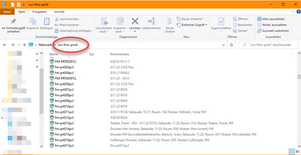 Öffnen Sie den Ordner scc-fmc-print im Datei-Explorer. Der Druckername beginnt mit dem Kürzel der Organisationseinheit, in den Kommentaren sehen Sie weitere Angaben, mit denen der richtige Drucker gefunden werden kann.