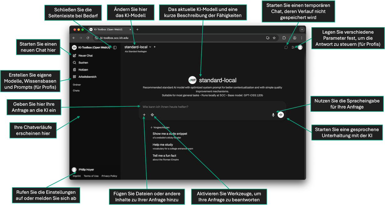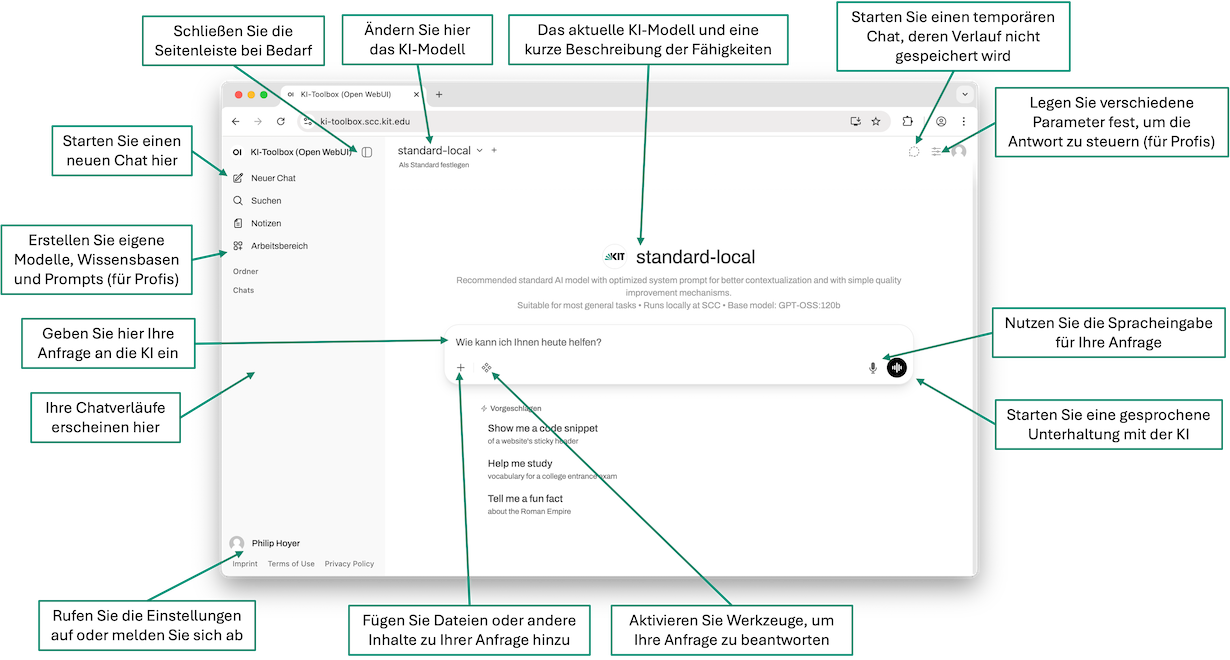 - Die KI-Toolbox bietet KIT-Mitarbeitenden einen komfortablen, web-basierten Zugang zur Nutzung von künstlicher Intelligenz (KI) über verschiedene, große Sprachmodellen (Large Language Models, LLM). Es stehen lokale Modelle mit maximaler Datenschutzsouveränität zur Verfügung, die ausschließlich am SCC betrieben werden. Zusätzlich sind Modelle über Azure OpenAI für generische Aufgaben verfügbar – ohne personenbezogene Rückschlüsse und ohne Verwendung eingegebener Daten zum Modelltraining. Voraussetzung für den Zugang zur KI-Toolbox ist das erfolgreiche Absolvieren der KI-Schulung auf KOALA.